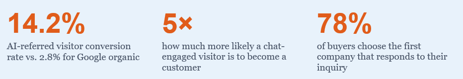 These are the existing numbers, before accounting for the specific and amplifying effect of AI-referred visitors. The point is that live chat was already the highest-converting reception mechanism for high-intent visitors. AI search is now systematically routing the highest-intent visitors on the internet to your site. The overlap between these two facts is not a coincidence. It is a structural opportunity.