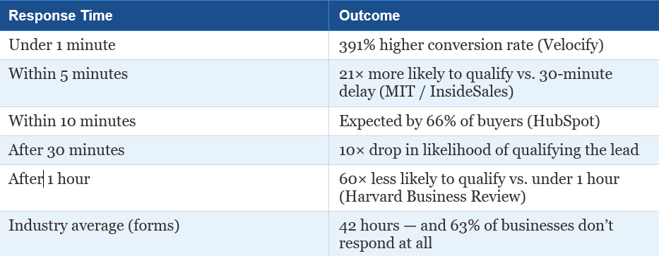 The data on response time and lead conversion is among the most consistent in sales research. A study from MIT and InsideSales, found that companies contacting leads within five minutes are 21 times more likely to qualify that lead than companies that wait 30 minutes. Responding within one minute increases conversion rates by 391% compared to longer delays. 78% of customers buy from the first company that responds to their inquiry.