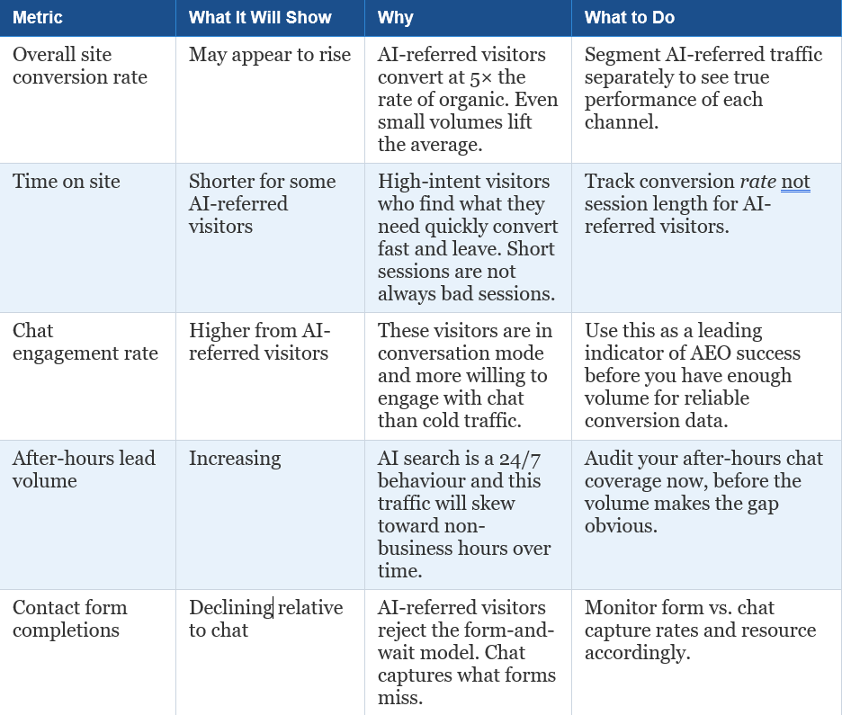 The most important metric change is the one that does not appear in your analytics at all. When an AI-referred visitor lands on your site outside business hours, finds no chat, a chat offline or a customer support AI bot, and leaves without converting, that event is invisible.There is no “lost lead” event in GA4. There is just a session that ended without conversion, indistinguishable in the data from a low-intent visitor who was never going to buy. The invisibility of these lost opportunities is one reason companies underestimate how much they cost.