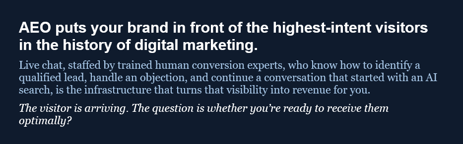 It is livechat staffed with human experts in conversational conversion, powered by AI. And in the age of Answer Engine Optimization, it has become the most important conversion infrastructure on your site.