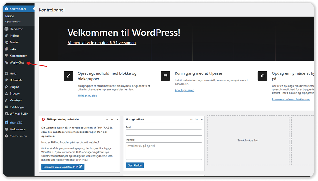 5. Na activering: Navigeer naar het menu „Weply Chat” in de zijbalk van de beheerder.