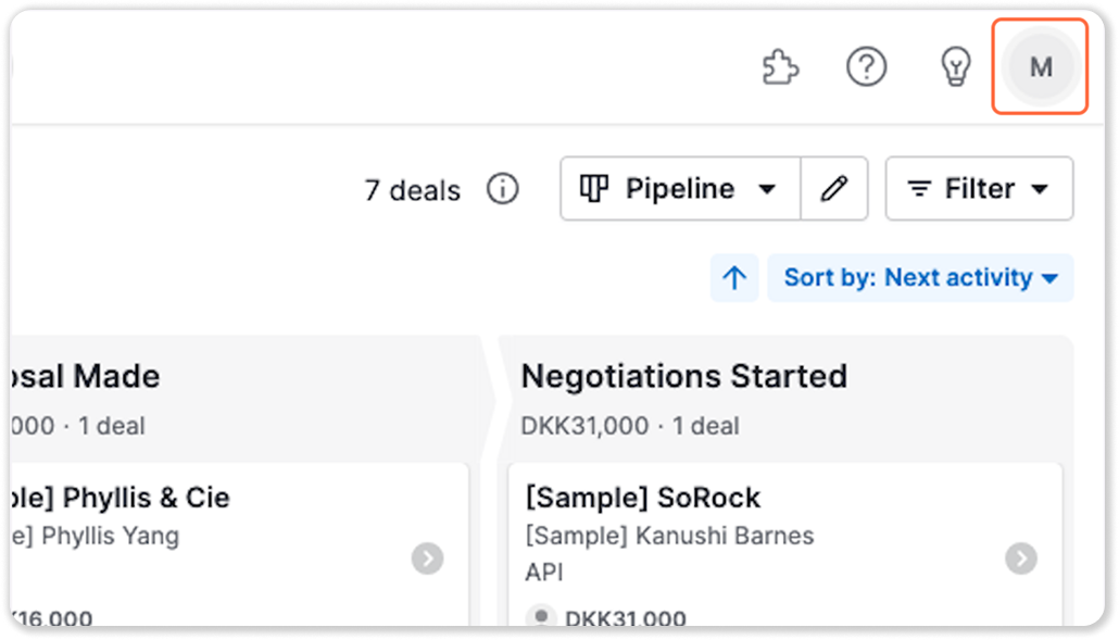1. Log in to Pipedrive and click your profile icon in the top-right corner