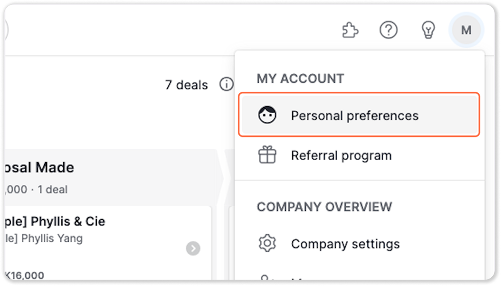 2. Select Personal preferences from the dropdown menu