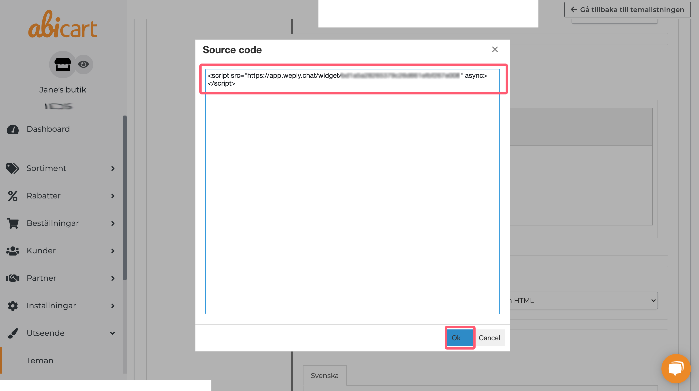 7. Kopiera scriptet du fick tillskickat, och klistra in i Source code boxen och klicka OK.