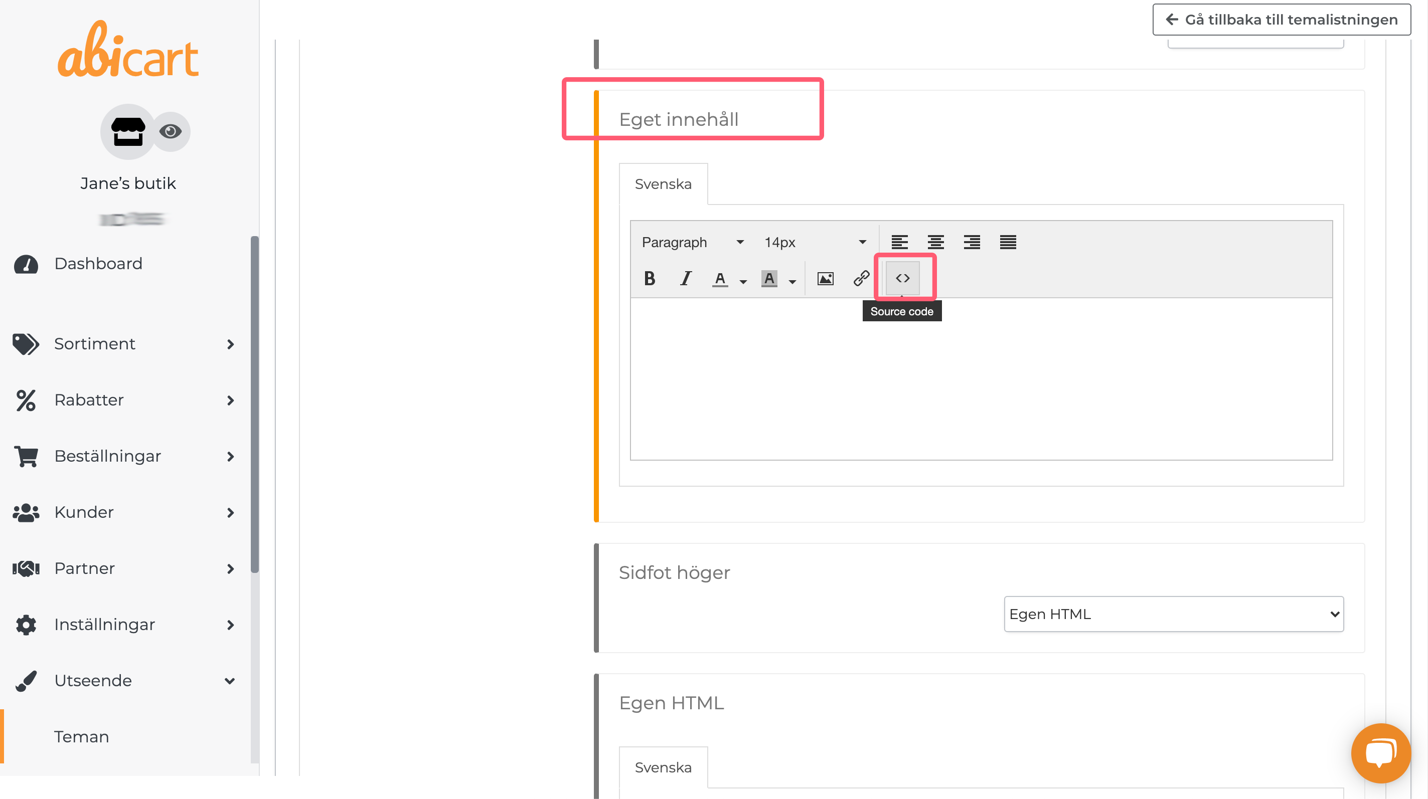 6. Scrolla ned till Eget innehåll, och välj Source code från redigeringsverktyget